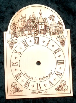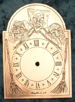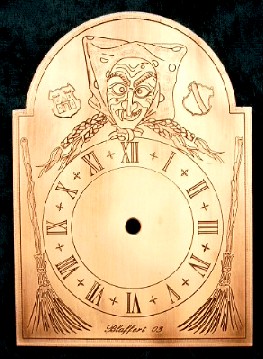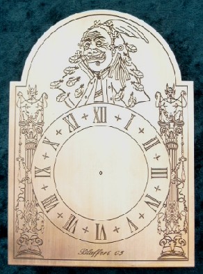 Die kleine Narrenuhr, hat ein Messingschild von 12cm Höhe, worauf ich Ihr Wunschmotiv eingraviere, schwärze und das Schild entweder bürste oder poliere.